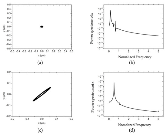 One of the typical non-linear dynamic behaviors of the system is shown in Figure 5 when the rotating speed is 50,000 r/min, the system external load (vertical direction) is 10 N, the rotor mass is 90 g and the unbalanced mass is 0.01 g. Under this rotating speed, the trajectory of the rotor is an ellipse with an amplitude of about 0.2 μm, and the direction of the polar axis is the same as that in Figure 4c. Due to the slight increase in rotating speed, the longitudinal polar axis is larger, and the elliptical trajectory in the figure is more obvious. The phase angle under this system is a belt-type ellipse, which is due to the phase angle vibration caused by the unbalanced mass, as shown in Figure 5b. Figure 5d clearly shows that under the typical non-linear dynamic behavior, the half-speed whirl motion begins to appear. This is because the energy to maintain the rotational motion caused by the fluid comes from the rotor movement, and the influences is enhanced with the rotating speed increases.