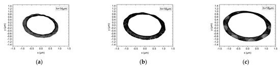 Rotor center trajectory under different gas film thickness under working condition 5 (high speed, dynamic unbalance G1), (a) rotor center trajectory (h = 14 μm), (b) rotor center trajectory (h = 16 μm), (c) rotor center trajectory (h = 18 μm).