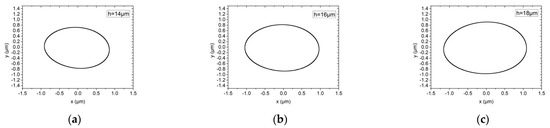 Figure 11 and Figure 12 show the influence of gas film thicknesses of 14 μm, 16 μm and 18 μm on the rotor trajectory of the hybrid air bearing-rotor system under working conditions (1) and (2), respectively. It can be seen that under rotating speed of up to 150,000 r/min, the maximum amplitude of the dynamic unbalance level G1 and G0.1 is about 0.8 μm under different gas film thicknesses. It can be seen that under the ultra-high speed condition, those with large unbalanced mass are belt-mounted elliptical trajectories, while those with small unbalanced mass are standard elliptical trajectories. This is because, at ultra-high rotating speed, the aerodynamic effect of the bearing system is significantly increased, and the peak energy density of the spindle system is mainly caused by the half-speed whirl motion of the hybrid air spindle. As the film thickness of the air film increases, the amplitude of the vibration of the spindle system will increase slightly.