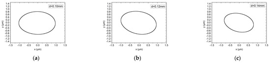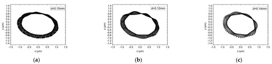 Figure 13 and Figure 14 show the influence of the orifice diameter on the rotor trajectory of the hybrid air bearing-rotor system under working conditions (1) and (2), respectively. The orifice diameters are 0.10 mm and 0.12 mm and 0.14 mm. Under ultra-high-speed working conditions, the system with larger orifice diameter could induce higher stiffness of the system and thus obtain smaller vibration amplitude. Similarly, different dynamic unbalance levels only affect the rotor trajectory of the hybrid air bearing-rotor system, and have little effect on the amplitude of the vibration amplitude of the rotor, which is different to the conclusion under the low speed condition. This is because the rotation of the spindle is no longer mainly restricted by the orifice under ultra-high-speed working conditions.