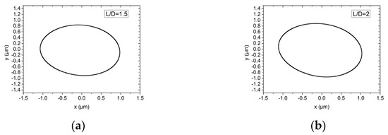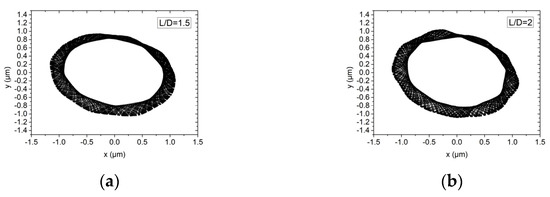 The influence of the bearing with L/D of 1.5 and 2 on the rotor motion trajectory of the hybrid air bearing-rotor system is shown in Figure 15 and Figure 16. Air bearings that are too short will cause dynamic instability of the spindle, while bearings that are too long will reduce the load-bearing ratio and angular stiffness of the spindle. Therefore, in this study, L/D = 1.5 and L/D = 2 are selected for discussion. In ultra-high-speed working conditions, the vibration amplitudes of the dynamic balance levels G1 and G0.1 are both about 0.8 μm. As the L/D ratio increases, the rotation amplitude of the spindle system will increase slightly.