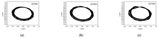 Rotor center trajectory under different supply pressure under working condition 5 (high speed, dynamic unbalance G1). (a) Rotor center trajectory (ps = 5 bar), (b) rotor center trajectory (ps = 6 bar), (c) rotor center trajectory (ps = 7 bar).