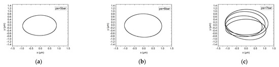 Figure 17 and Figure 18 analyze the influence of the supply pressure on the rotor motion trajectory of the hybrid air bearing-rotor system. The supply pressure is 5 bar, 6 bar and 7 bar, respectively. Under ultra-high speed conditions, different air supply pressures have little effect on the hybrid pressure air bearing-rotor system with a dynamic balance level of G1, and the vibration amplitude of the rotor is about 0.8 μm. Similarly, in a system with a dynamic balance of G0.1, the influence of air supply pressure on the trajectory of the rotor center is also limited. However, in a system with an air supply pressure of 7 bar, the center trajectory of the rotor is characterized as a multi-elliptical T-shaped cross. This is because at this air supply pressure, the center of the rotor begins to significantly perturb at low frequencies. Therefore, at high speeds, the air supply pressure of the spindle should be kept below 6.5 bar.