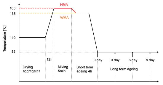 HMA and WMA consist of aggregates, bitumen, filler, and additives [16]. Their global mechanical performances entirely depend on their component’s percentage, the properties with the time evolution, and their interaction with each other [17]. During the design phase of the mixtures, it is fundamental to predict or at least estimate the evolution of rheological behaviours of binders and mixes to ensure the durability of the whole infrastructure [18]. In particular, WMA has more complex components, its mixing and paving temperatures are different from those of HMA, and its ageing protocols are still under investigation [19].