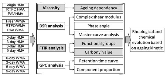 Figure 2 presents the detailed investigation program employed in this study to characterise the rheological and chemical evolution of both WMA and HMA binder based on ageing kinetics. Viscosity, DSR, FTIR, and GPC analyses were conducted for fundamental study on the slow ageing evolution of asphalt binder in the warm mix and hot mix, by means of both chemical study and mechanic test.