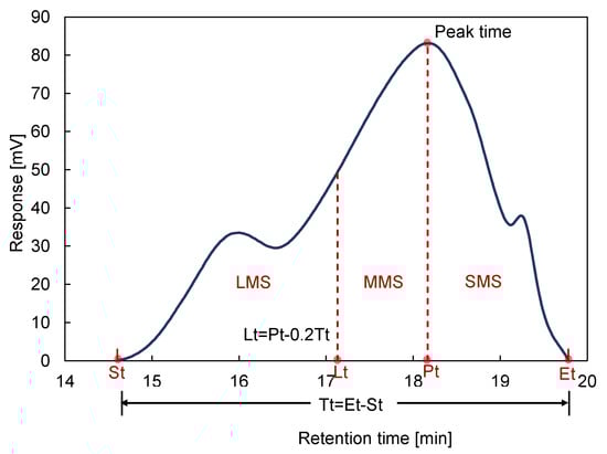 Illustration of determining LMS time (Lt) from total retention time (Tt) of the chromatogram of virgin binder (asphalt A), based on ending time (Et) and starting time (St) [22].