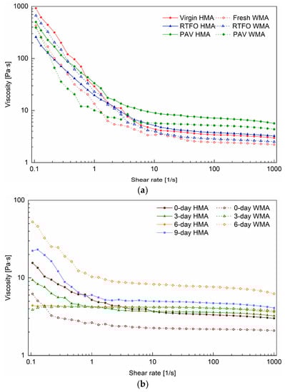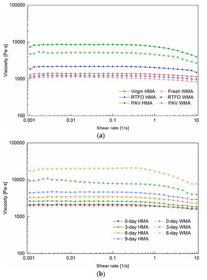 With the shear rate ranging from 0.001 s−1 to 1 s−1, a Newtonian plateau was observed for all binders, and their zero-shear viscosity was obtained. In comparison, the zero-shear viscosity of fresh WMA binder was lower than the virgin HMA binder, due to the addition of a warm agent. The zero-shear viscosities of 0-day HMA and 0-day WMA binders were very close and higher than that of virgin HMA. This means that ageing occurred while producing the HMA and WMA mixtures. When the shear rate was higher than 1 s−1, the shear-thinning behaviour was observed and was more evident for aged binders, such as PAV HMA, PAV WMA (Figure 4a), 3-day WMA, and 6-day WMA binders (Figure 4b). Shear thinning occurs because the macromolecule chains usually exist in a state of random orientation and high entanglement, and they will become disentangled and oriented at high shear rates. It was revealed that ageing increased the content of macromolecules in the bitumen.
