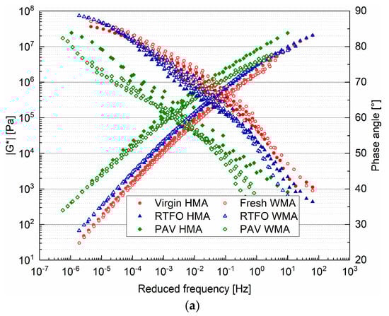 For the binders shown in Figure 6, a general observation was that the complex modulus of the binders converged at the high-frequency region, and the phase angle converged at the low-frequency area. Due to the addition of the warm agent, the fresh WMA binder had a slightly lower complex modulus and a higher phase angle than the Virgin HMA binder (Figure 6a). In comparison, the modulus master curve of the PAV WMA binder was located below that of the PAV HMA binder. This means that the warm agent used in this study improved the ageing resistance of the virgin binder.