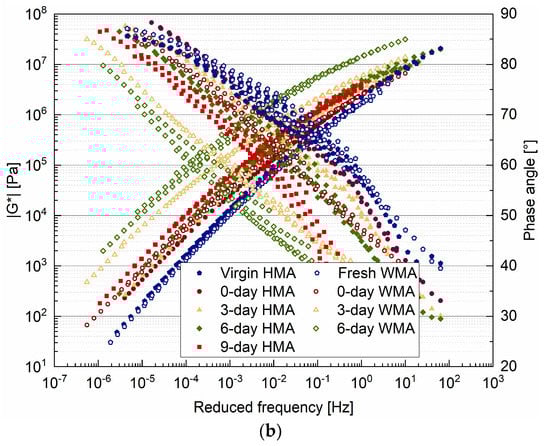 As shown in Figure 6b, the modulus master curve of the 0-day HMA binder was located above that of the virgin HMA binder due to short-term ageing, as illustrated in Figure 1. The complex modulus of binders gradually increased with ageing time. The complex modulus of the 0-day WMA binder was very close to that of the 6-day HMA. It was found that the binder in the WMA mixture quickly aged in the oven. The 6-day WMA binder had the highest complex modulus and the lowest phase angle. The 9-day WMA binder was too hard to undergo experiment by the frequency sweep.