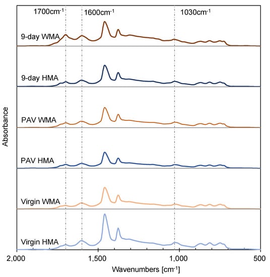 As shown in Figure 7, FTIR was used to evaluate the ageing behaviour of HMA and WMA binders. Typical peaks were observed, such as in-plane bending vibration of the –OH groups at 1627 cm−1 and the scissoring vibration of –CH2 at 1464 cm−1. There was no specific characteristic peak for the warm agent when comparing fresh WMA and virgin HMA binders. Two critical functional groups were characterised by the FTIR spectra. One was the carbonyl group at 1700 cm−1, and another was the sulphoxide group at 1030 cm−1. Both belong to the stretching vibration and are formed due to the oxidation, dehydrogenation, and crosslinking reactions occurring simultaneously. The carbonyl group was more sensitive to ageing in this study, and its band became broader as ageing proceeded. Therefore, the CI value was used to characterise the ageing degree semi-quantitatively.