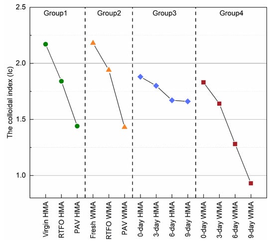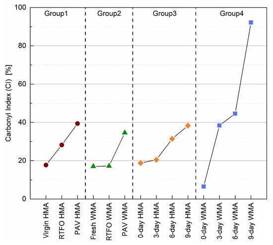 Figure 8 shows a clear evolution of ageing for four binder groups based on their CI value. The more severe the oxidation reaction carried out, the more carbonyl groups were formed. Before ageing, the binders of virgin HMA, fresh WMA, 0-day HMA, and 0-day WMA had a comparable CI value. As ageing proceeded, the CI value for the virgin HMA binder in group 1 increased linearly, from 17.8% to 39.4%. However, the CI value for the fresh WMA binder in group 2 almost did not change after RTFO ageing.