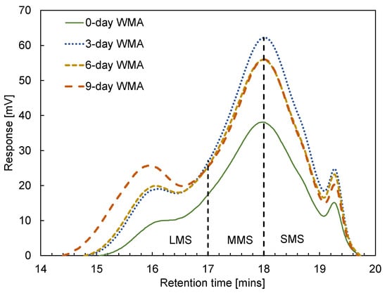 Figure 9 shows a typical example of GPC curves for the binders in group 4. There are mainly three peaks from left to right for each curve, representing LMS, MMS, and SMS parts. For the binder from 0-day WMA to 9-day WMA, three main peaks shift to the left. The width of the first peak represents the part of LMS increased, which means that the bituminous molecules were transformed from small to large ones due to ageing.