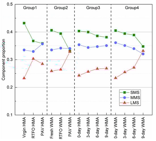 Figure 10 shows the change in the component proportion of each binder due to ageing. In general, the SMS proportion decreased, but that of the LMS increased as ageing proceeded. However, the changing trend in the MMS proportion depended on the binder group and ageing condition. Volatilisation and oxidation simultaneously occurred when preparing fresh WMA, 0-day HMA, and 0-day WMA binders. Therefore, they had a lower SMS and a lower LMS than the virgin HMA binder. The LMS component increased sharply for binder group 2, and three components became comparable after PAV ageing. Three components for group 3 had a slight change as ageing proceeded. Even after the 9-day oven ageing, the LMS component only increased by 9.3%. This means that the HMA mixture had better ageing resistance. For group 4, both SMS and MMS decreased, and the LMS dramatically increased to 45.8%.