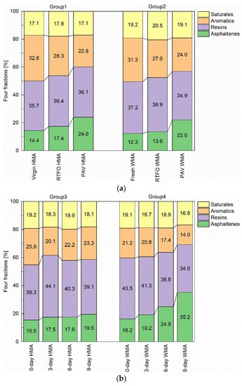 For group 3, its asphaltenes content increased slightly as oven ageing proceeded (Figure 11b). However, the changing trend for aromatics and resins fluctuated. For example, there was a decrease in resins but an increase in aromatics after the 6-day oven ageing. The reason could be that decomposition occurred on resins [26]. For group 4, there was a clear changing trend for each fraction. After 9-day oven ageing, aromatic and resins were continuously transformed towards asphaltenes, which reached 35.2%; the value of asphaltene confirmed its considerable ageing condition.
