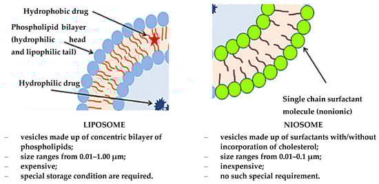 The introduction of cholesterol during the synthesis of niosomes improves the rigidity of the bilayer. This structure protects drug molecules from premature degradation and inactivation due to adverse immunological and pharmacological effects [53]. A comparison between liposomes and niosomes is shown in Figure 2.