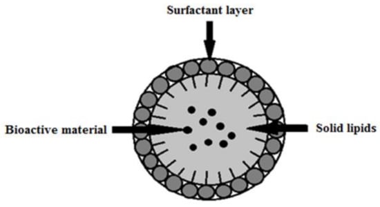 Solid lipid nanoparticles (SLNs) are colloidal carriers that were first synthesized in 1991 as an alternative to liposome, emulsion, and polymeric micro- and nanoparticle-based systems [68]. SLNs combine the advantages of traditional colloidal carriers and avoid some of their major drawbacks [69]. They are stable at room temperature and at human body temperature [70,71]. SLNs usually have a spherical shape and a diameter in the range of 50–1000 nm. Solid lipid nanoparticles consist of a core of solid lipids in which a bioactive component is embedded, and this structure is stabilized by a surfactant coating (Figure 3).