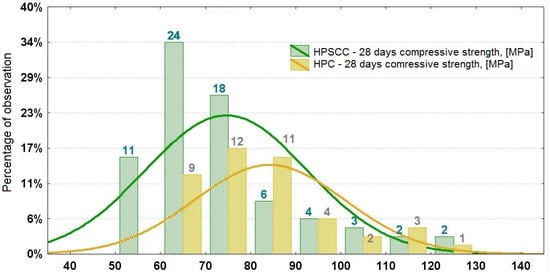 Figure 1. Histogram of 28-day compressive strength for HPSCC and HPC [18,21,22,23,24,25,26,27,28,29,30,31,32,33,34,35,36,37,38,39,40,41,42,43,44,45,46,47,48,49,50,51,52,53,54].