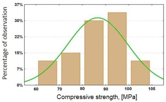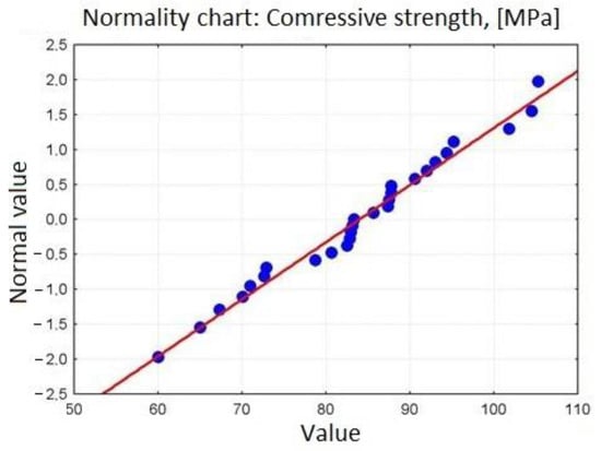The chart in Figure 3 suggests that we are dealing with a normal distribution. To check the normal distribution, a diagram of normality for the obtained compressive strength is presented (Figure 4).