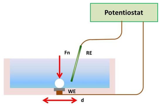 Schematic representation of reciprocating ball-on-plate tribocorrosion experimental setup: Fn—normal load, d—alternative displacement; WE—working electrode (tested sample); RE—reference electrode (saturated calomel electrode).