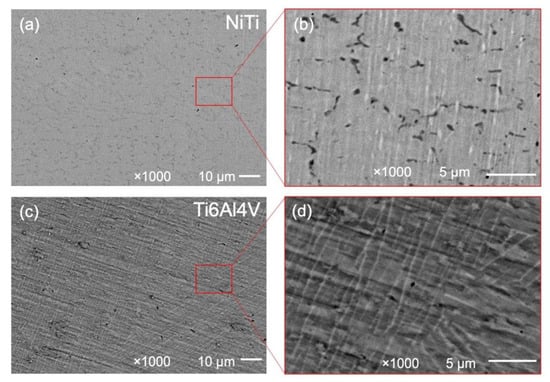 Microstructure of LB-DED NiTi (a,b) and Ti-6Al-4V (c,d) alloys with two different magnifications (1000× and 5000×).