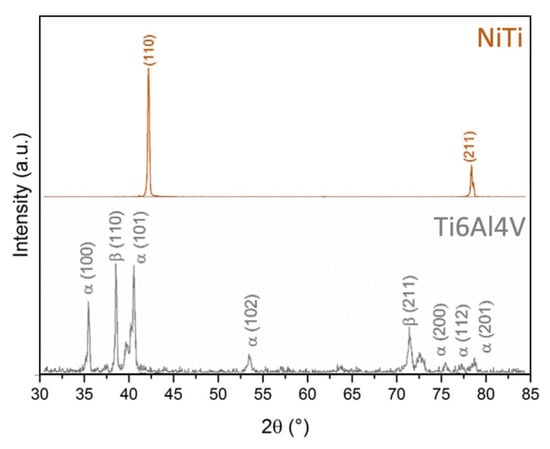 X-ray diffractometer (XRD) using Bruker AXS D8 Discover (Bruker, Karlsruhe, Germany) was used to identify the phase of the LB-DED NiTi and Ti-6Al-4V samples. XRD was performed in the 2-theta (2θ) range between 30–90° with a Cu-Kα radiation source, 0.05° scan step, and a 2 s counting time.