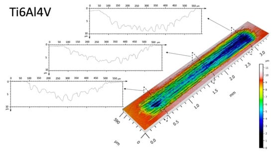 Figure 4 shows the surface topography images of the wear track for the LB-DED NiTi and Ti-6Al-4V alloys and also three 2D profiles in different zones of the wear tracks, while the evolution of the COF with time is given in Figure 5.