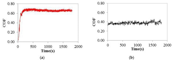 Regarding the COF values obtained in this study, it can be seen from Figure 5 that, in the case of the LB-DED NiTi alloy, a higher value of around 0.62 ± 0.03 was registered as compared to the LB-DED Ti-6Al-4V alloy with a value of around 0.37 ± 0.01. Similar COF values recorded during the steady state stage are reported in the literature for NiTi alloy, ranging from 0.5 to 0.7 (under wet conditions) [1,38]. Concerning the evolution of COF with time, the typical two friction stages were observed: running-in and steady state stages. The running-in stage can be better observed in the case of the LB-DED NiTi alloy (Figure 5a) since it is a bit longer than in the case of the LB-DED Ti-6Al-4V alloy (Figure 5b). Thus, in both cases, the COF values increased until the steady state value was reached. Some oscillations of the COF values with sliding time could be observed in the case of the LB-DED Ti-6Al-4V alloy (Figure 5b), while a more stable evolution of the COF values is obtained in the case of the LB-DED NiTi alloy (Figure 5a). The oscillations observed in the COF evolution of the LB-DED Ti-6A-l4V alloy are associated to the release of metallic particles during sliding movement, which means that the third body effect was active (three-body abrasive wear).