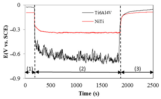 The evolution of the OCP recorder for all three steps of the tribocorrosion test is presented in Figure 6. The OCP was measured before sliding, when (1) no load is applied (only under the influence of corrosive environment), (2) during the reciprocating sliding wear test and, therefore, under loading (under the synergetic action between the mechanical loading and the influence of corrosive environment), and (3) after sliding, when the load is removed (only under the influence of corrosive environment).