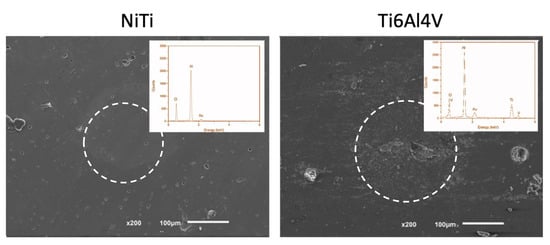 Thus, both the Ti6Al4V and NiTi alloys considered in this study are used in medicine, but for different applications. Therefore, it is interesting to see whether Ti6Al4V alloy can be substituted by NiTi alloy in some medical uses, such as implants. It is well known that the materials used for implants should have some fundamental technical specifications. There should be a compromise between the bulk and surface properties (lower Young’s modulus that should be comparable to the bone, high strength, adequate ductility, high hardness, etc.), and, of course, biocompatibility (corrosion resistance, etc.) [17]. The major concern in the failure of implants is related to the bone in-growth process after the implantation [18]. Therefore, NiTi alloy, due to its good wear resistance and shape memory effect, may act as a key factor in the healing process by stimulating the bone in-growth properties [19,20] and thus reducing the healing time and, in some cases, avoiding a new surgery.