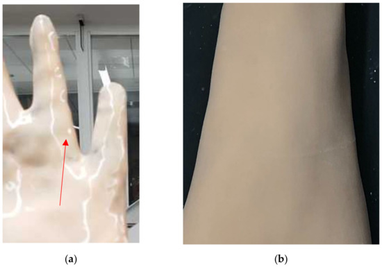 This matte surface appears closer to human skin, adding realism and believability to the target tactile stimuli. This added fidelity reduces friction when students transition to practicing with real patients later in residency [13]. To produce this matte finish on the outside of the skin covering, the arm model was mirrored in Meshmixer (Autodesk, San Rafael, CA, USA), a freely available mesh manipulation software [14], to produce an identical left-arm copy prior to printing. The rubber is applied to the surface of the left-arm overmold and the cured skin is inverted when removed. This creates a surface that will perfectly conform to our right-arm phantom model. Material cost for one phantom’s skin covering is approximately $10.