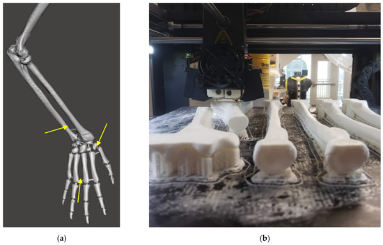 (a) Photograph showing the modified bone model in Meshmixer. Individual bones are fixed to one another with small pins, examples identified with yellow arrows. The phantom created for this study also incorporates a DRF modification, circled in red. (b) Sample long-bones of the phantom skeleton being printed with the Raise3D FDM machine.