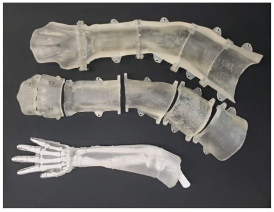Repeating the procedure for setting the bone pose, we then scanned the arm of a lab member who closely matched the size of the SawBone. This scan was used in Meshmixer to create the mold for casting the bones. After using Boolean operations to create the internal cavity of the mold, we separated it into segments for 3D printing. The bones are cast using ballistic gelatin, which must be heated above 275 °F (135 °C) to melt. The mold pieces are printed using stereolithographic (SLA) FormLabs Form3 resin printers (FormLabs, Somerville, MA, USA), which create smoother and more temperature-resistant prints than those produced by FDM [19]. The pieces are reassembled into the reusable molds shown in Figure 6. The ballistic gelatin required for one phantom costs approximately $60. After the heated gelatin cools, the model can be demolded and covered in our opaque skin, multiple of which are shown in Figure 7. These completed models are sent to our collaborating surgeons for evaluation, as shown in Figure 8, when revising the fracture site or joint pose. If that revision of the model responds appropriately to manipulation, they are used to practice and assess DRF management techniques in residents.