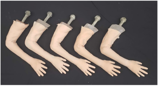 Photograph showing the replicability of full-arm phantoms, with slight variations seen in flesh and skin truncation along the humerus.