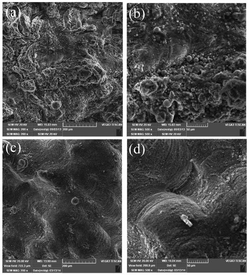 SEM topology under different magnifications of specimens fabricated using magnesium powders with granularity of (a,b) 400 mesh and (c,d) 250 mesh. Reprinted with permission from ref. [36]. Copyright 2015 Taylor and Francis Group.