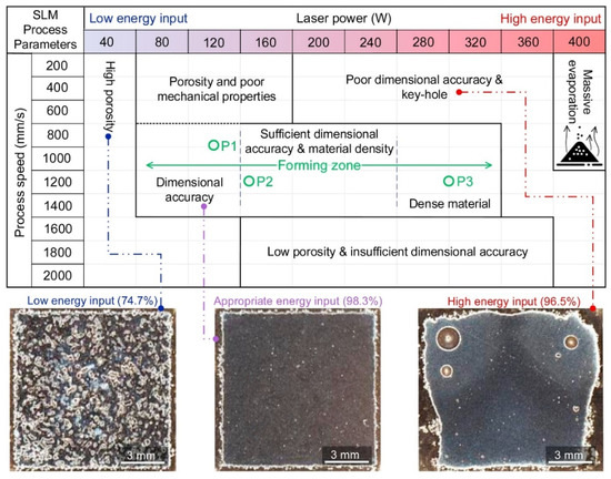 The main advantage of SLM technology is that it can produce metal parts with high density. However, since the absence of mechanical pressure, fluid dynamics is mainly driven by gravity, capillary action and thermal effect, so it is not easy to achieve this goal. In addition, the lack of mechanical pressure during the SLM process may reduce the solubility of some elements during solidification, resulting in discontinuous melting to form pores and surface irregularities. Therefore, appropriate parameters (include power density, scanning distance and speed, and layer thickness etc.) need to be carefully selected to obtain parts with good quality. Taking WE43 as an example, Figure 3 shows the influence of SLM process parameters on the formability of magnesium alloy. When specimens were produced in the low energy input zone, they exhibited poor mechanical strength due to the extensive presence of process-induced pores and lack of fusion. At high energy inputs, a loss of the Mg content occurred due to its low boiling point. An appropriate volume energy density (EV) can be obtained by adjusting process parameters [38]. Volume energy density EV is defined as the laser energy per volume and can be calculated by the following equation: