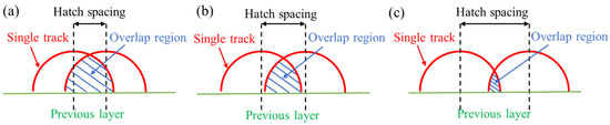 Schematic diagram illustrating the effect of hatch spacing on area of overlap region: (a) low hatch spacing; (b) suitable hatch spacing; (c) high hatch spacing. Reprinted with permission from ref. [43]. Copyright 2020 Elsevier.