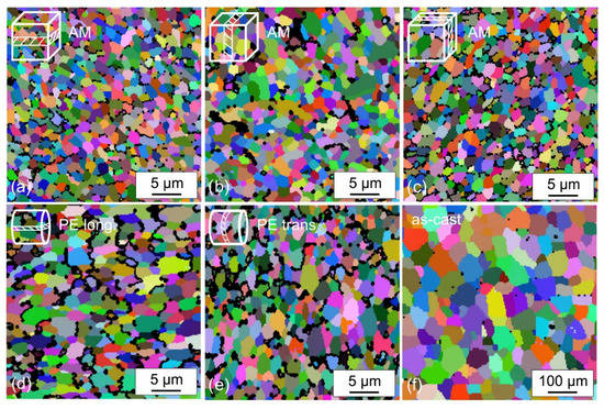 Electron backscatter diffraction of (a–c) selective laser melting, (d,e) of powder extruded, (f) of as-cast material. Reprinted with permission from ref. [58]. Copyright 2019 Elsevier.