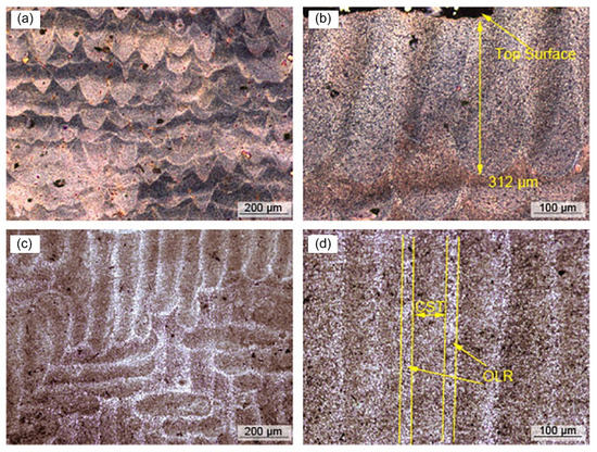 Optical micrographs of the AZ91D sample deposited at Ev of 166.7 J/mm3. (a,b) The vertical section, (c) the cross section, and (d) the detail of scanning tracks shown in (c). Reprinted with permission from ref. [47]. Copyright 2014 Elsevier.