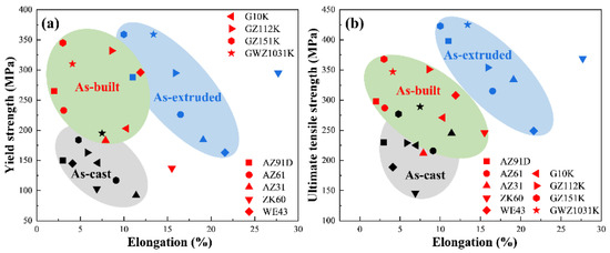 Comparison of room temperature tensile properties of the typical Mg alloys under the as-cast, as-built and as-extruded states (a) YS vs. EL, (b) UTS vs. EL. Reprinted with permission from ref. [74]. Copyright 2022 Chinese Academy of Sciences.