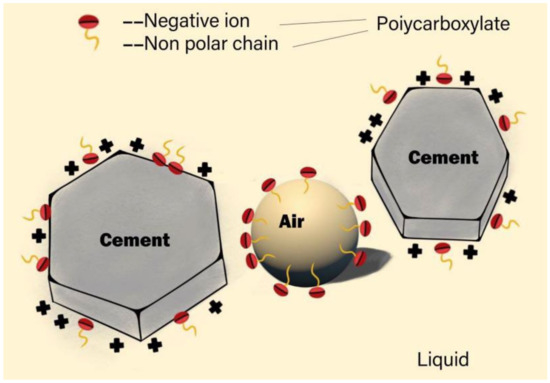 According to the volume change of bubbles, the bubble life cycle has four stages: generation, growth, stability, and rupture. The generation of concrete bubbles involves both macroscopic and microscopic factors. Macroscopically, the artificially or mechanically created vortex swirls into the air to form a large number of bubbles with an uneven volume, and a small number of bubbles comes from the air dissolved in the water [7]. Microscopically, the air-entraining and dispersion effects of admixtures can introduce bubbles and promote their generation. The surface tension and diffusion properties of the air-entraining agent in the gas–liquid boundary play an important role in forming its air-entraining ability [8]. The various functional groups in the structure of the PCE superplasticizer greatly affect its air-entraining performance [9]. The Ca2+ concentration in the cement slurry increased continuously until reaching the maximum value near the end of the induction period. The air solubility in the pore solution lowered during the induction period, with air released and bubbles formed [10]. The relevant mechanism of action is shown in Figure 1 below.
