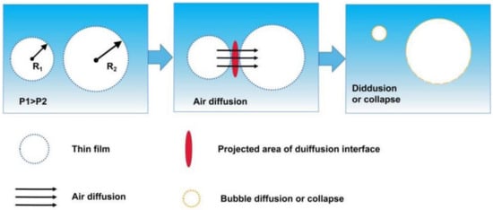 Coarsening. Coarsening refers to the process in which bubble size increases through gas diffusion between adjacent tiny bubbles [50]. After coarsening, the bubble system had a decreased total surface area and more liquid was withdrawn from the bubble structure. When small bubbles broke into large bubbles more frequently, the liquid discharge rate increased under a higher coarsening rate, and the bubble film discharge rate affected the bubble film strength, which in turn resulted in bubble instability and rupture [25]. The total energy of the entire concrete bubble system decreased with increasing bubble size [51]. During the coarsening process, the bubble size increased and the number decreased. As shown in Figure 5 below, gas dissolves from surrounding small bubbles into greater bubbles, with smaller bubbles shrinking and greater bubbles expanding over time.
