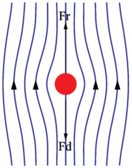 In their process of formation, concrete bubbles will be subjected to upward buoyancy, downward surface tension, bubble inertial forces and drag forces, etc. Bubbles have vertical and horizontal movements. In vertical movements, the rise of bubbles is negatively correlated with the liquid phase viscosity, a process affected by buoyancy, viscous resistance, and self-gravity [3], as shown in Figure 3. In the rising process, the bubble force was analyzed according to the Navier–Stokes equation [15], and its rising speed was proportional to the buoyancy force and inversely proportional to the frictional force. However, the bubble did not perform linear motion in the rising stage, but swung upward along the central axis. Under greater viscous resistance, the trajectory presented greater linear tendency [16].