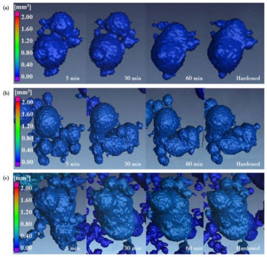 Coalescence. According to the classic model of bubble coalescence in aqueous solutions [41], bubble coalescence can be viewed as a process of liquid film drainage in which long side-chain PCE is used as surfactant, and its side-chain molecular structure will cause gas–liquid interface changes in the chemical and physical properties [42,43]. Since long side-chain PCE has a greater relative molecular mass than ordinary PCE, it is less likely to retain in the free solution of fresh concrete under the same conditions. As a result, its surface tension gets greater and the bubble liquid film gets thinner, resulting in an earlier bubble coalescence time [44] as shown in Figure 4. CT three-dimensional reconstruction technology was used to observe the evolution of local bubble morphology in the concrete mortar under ordinary PCE, ether long side-chain PCE, and ester long side-chain PCE, respectively [45]. It could be clearly observed that the adjacent bubbles coalesced in all the three groups of samples. In Figure 4, the bubbles corresponding to the common PCE coalesce at 30~60 min, while in Figure 4b,c, the bubbles corresponding to ultra-early strong PCE coalesce at 5~30 min.