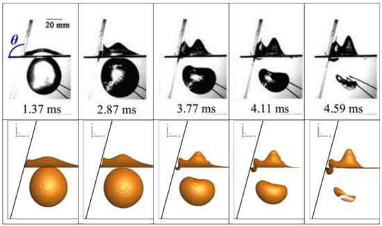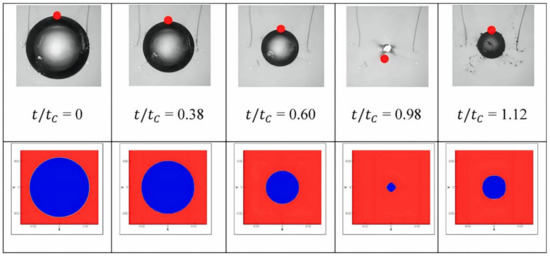 At present, most research on bubble behavior stays in the stage of clear water solutions. Appropriate mesh size and bubble parameters are important guarantees for reliable and effective simulation results, which are also difficult problems in simulation calculations. Nguyen et al. [52] studied validation experiments of bubble collapse and 3D simulations of bubble collapse near inclined walls. Bubble collapse was simulated under the hypothesis of five meshes and axisymmetric flow, with different numbers of units set for the initial bubble radius. Figure 6 shows a comparison of the bubble evolution during the numerically simulated collapse in the experimental image and the fine grid. Numerical results show that, by geometric interface reconstruction of VOF-PLIC, the sharp interface and collapse behavior of bubbles can be simulated, which is consistent with the experimental results. Figure 7 shows a visual comparison of the simulated and experimental images of the bubble growth process, and the numerical simulation results are in good agreement with the experimental results. In the later stages of bubble growth, the bubble began to take on an elliptical shape, and the upward-moving free surface interacted with the inclined walls, creating splashes at the corners between the free-surface walls and the dome. Using the VOF (Volume of Fluids) and GMO (General Moving Object Technique) models, Fantous et al. [53] successfully simulated the dynamic interaction between three different phases of cement paste, aggregates, and bubbles by the CFD (Computational Fluid Dynamics) method. Numerical simulations showed that both the diameter and the initial vertical position of the bubbles significantly affected the void system stability in both static and dynamic shear modes. Therefore, greater bubbles located in the top layer of the cement paste were more unstable than smaller ones initially placed in the bottom layer of the cement paste. At the same time, it was proved that the displacement and deformation characteristics of bubbles are more likely to be controlled by the shear mode and the shear source distance.