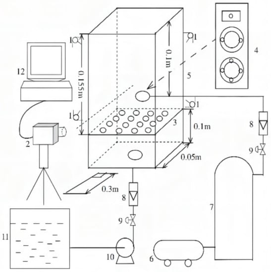 Schematic diagram of the gas–liquid bubble column with single- or multiple-orifice gas distributors. (1) Incandescent lamp; (2) CMOS high-speed camera; (3) liquid distributor; (4) gas distributor; (5) bubble column; (6) air compressor; (7) air storage tank; (8) rotameter; (9) regulating valve; (10) centrifugal pump; (11) liquid storage tank; (12) personal computer.
