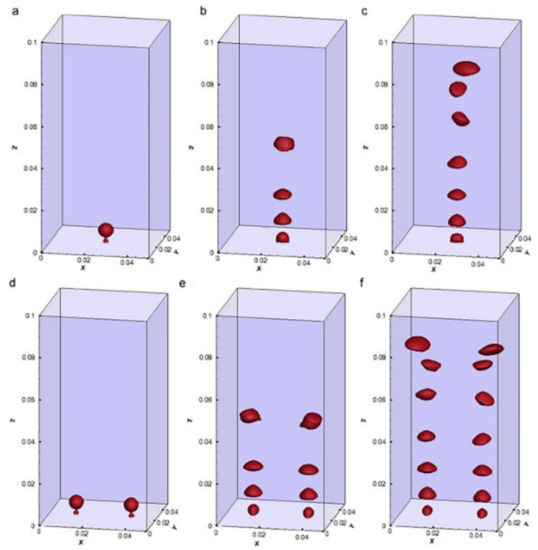 Some scholars carried out three-dimensional numerical simulations of the interactions between parallel bubbles under the VOF model [54]. A gas–liquid bubble column made of plexiglass was built to investigate experimentally the bubbling behavior including the bubble formation, growth, and rising motion. The experimental setups are shown in Figure 8. In order to eliminate the impact of light refraction on the visual measurements, the bubble column has a square cross section with a side length of 50 mm. Three types of gas distributors, including one-, two- and four-orifice distributors, are shown in Figure 8. The vertical distance between the gas distributor and the liquid distributor is 55 mm, and the chamber under the liquid distributor is 100 mm in height. Water in the storage tank was pumped by a centrifugal pump, regulated by a controlling valve, measured by a rotameter, distributed by the liquid distributor, and finally entered into the bubble column. Air was compressed by an air compressor, stabled in an air storage tank, regulated by a controlling valve, measured by a rotameter, distributed by the gas distributor, and ultimately passed into the bubble columns. Air and water co-currently flowed upward with the generated bubbles. Figure 9 below shows a comparison of the bubble behaviors in the case of a single well and a double well under the same operating conditions. The pictures at time t = 0.050 s, 0.225 s, and 0.375 s, respectively, showed the first separation of bubbles from the orifice, the first coalescence in the vertical direction, and the second coalescence in the vertical direction. For a period of time, there was no interaction between the double-pore and single-pore parallel-rising bubbles. Hence, bubbles with a large relative center spacing have negligible interactions. The two parallel bubbles did not merge, but the left and right bubbles had different rising speeds, presenting a non-linear rising path as shown with Figure 9. In order to detect different phenomena, the hole distance was adjusted to an appropriate distance (12.75 mm), as shown in Figure 10 below.The analysis shows that when the bubble diameter exceeds a certain value, the interaction is ignorable.