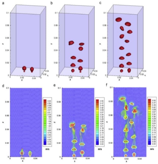 Snapshots (a–c) and velocity vectors (d–f) during the rising of two parallel bubbles when the distance between the two orifice centers was 12.75 mm, vg = 3 m/s, and vl = 0.01 m/s. (a) t = 0.050 s, (b) t = 0.225 s, (c) t = 0.375 s, (d) t = 0.050 s, (e) t = 0.225 s, and (f) t = 0.375 s.