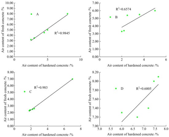 The behavior of concrete bubbles is affected by multiple factors such as different types of air-entraining agents and the PCE structure, raw material composition, construction technology, link temperature, ambient air pressure, etc. Air-entraining agents and PCE superplasticizer have the most significant effects. Using the image analysis method, Rath et al. [55] tested the bubble structure parameters under the action of different air-entraining agents and performed RGB image acquisition, image enhancement, image grayscale processing, binarization, object segmentation, and measurement analysis operations. The results showed that type of air-entraining agent significantly affected the correlation between the air void of fresh concrete and hardened concrete, as well as the average bubble diameter. As shown in Figure 11, the main components of air-entraining agents A and C are triterpene saponins and mixtures of alkyl ethoxyammonium sulfate and fatty alcohol, and the main components of air-entraining agents B and D are anionic and non-ionic mixtures such as sodium dodecyl sulfate, fatty alcohol, and polyether. The fresh concrete introduced with air-entraining agents A and C has a higher correlation with hardened concrete in terms of the air void, while the addition of other types of admixtures makes the correlation lower. It suggests that bubble content, stability, and bubble liquid film strength are greatly different when different types of air-entraining agents are introduced.