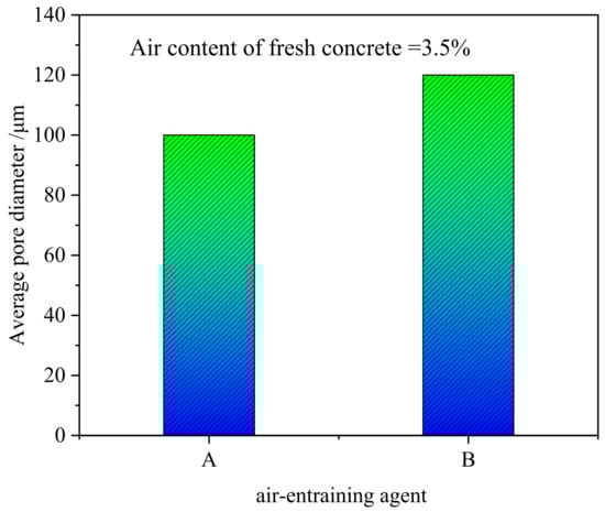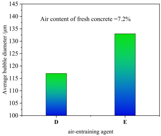 Under the same air void in the fresh concrete, the addition of different types of air-entraining agents also created obviously different effects on the average bubble diameter, as shown in Figure 12 and Figure 13. It suggests that it is inappropriate to characterize the state of concrete bubbles using only a certain index such as air void.