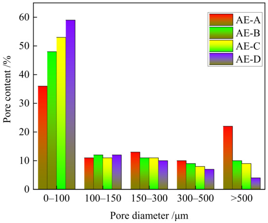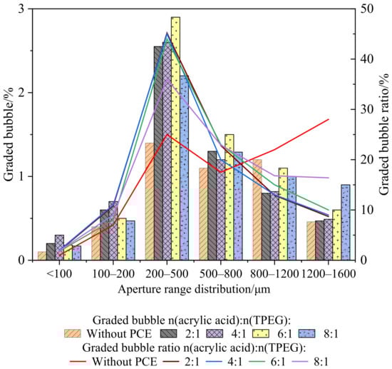 Acid-to-ether ratio. He Yan [62] synthesized a series of PCEs in different acid-to-ether ratios by aqueous solution radical polymerization. Greater acid-ether ratios increased its adsorption capacity on the cement particle surface, which reduced the cement particle–water and solid–liquid interfacial energy and significantly increased the air entraining performance of PCE, thus significantly improving the pore-size distribution of bubbles. With the increase in the acid-ether ratio, cement mortar had a significantly increased air void. Under an acid-ether ratio of 4:1, the air void in the cement mortar reached the maximum value. Therefore, PCE could significantly improve the pore-size distribution of hardened mortar, introduce excessive medium and small bubbles, and reduce the proportion of large pore-size bubbles so that the pore-size distribution of the bubbles was finer. At the same time, with the increase in the acid-ether ratio in the main PCE chain, the proportion of introduced small pores decreased, while the proportion of macropores increased, as shown in Figure 16.